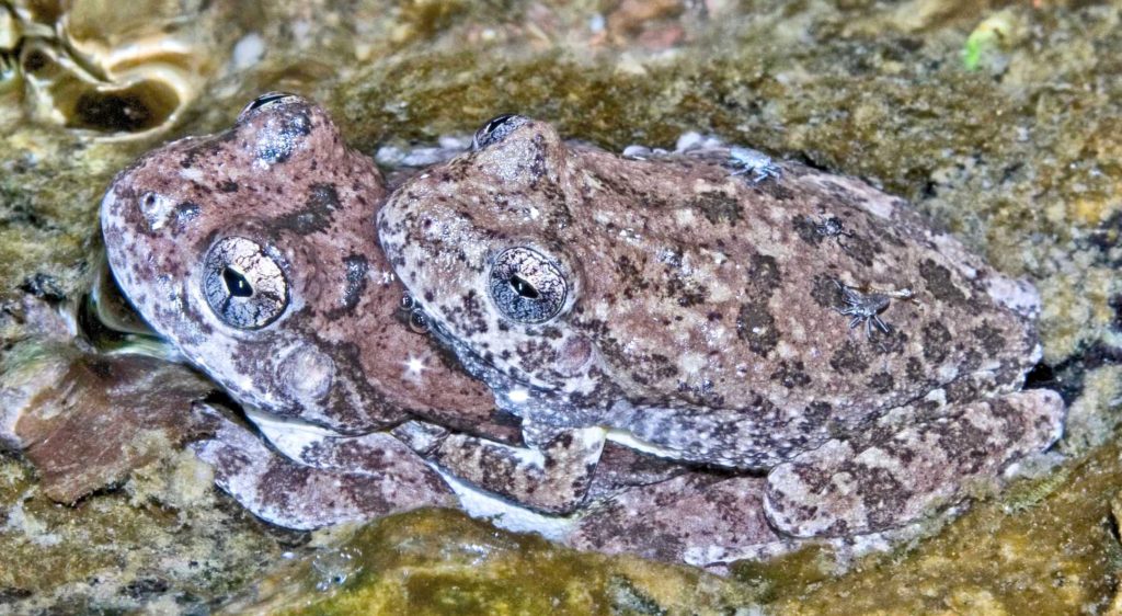 At any rate, the need for water in this species is clearly less than for strictly aquatic frogs. At night and during the summer rains, they forage away from stream pools. In winter, while searching for Desert Tortoises (Gopherus morafkai), famed local herpetologist Roger Repp and I have found them tucked into rock crevices more than 100 meters from water. Like other terrestrial treefrogs, they do not seem to need standing water at all in wet periods. For example, who would expect to encounter Hyla arenicolor in talus slopes at high elevations in the Sky Islands? But there they are, far from any obvious water, climbing around on the rhyolite with Mountain Spiny Lizards (Sceloporus jarrovii) and Twin-spotted Rattlesnakes (Crotalus pricei).
