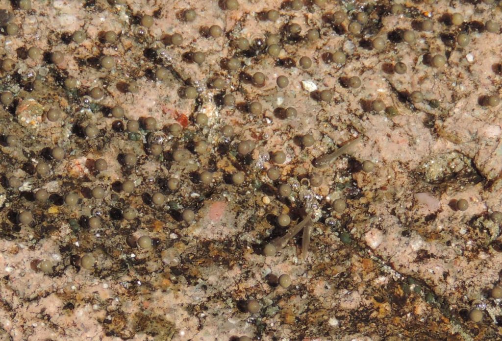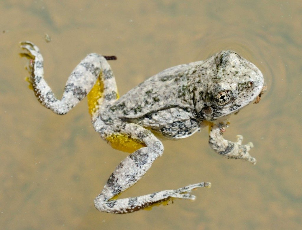 These little treefrogs are about an inch or two in length (2.5-5 cm) from snout to vent, with rough skin, large and distinctive circular pads on their toes, and cryptic dorsal coloration (Fig. 1). Underneath, they are creamy white, with bright yellow or orange on the undersides of their legs. These frogs are seldom seen, yet I find that nearly every serious hiker and naturalist in Tucson knows they are out there and remembers their first experience with them. For who expects to find a treefrog in the desert? And who expects it to suddenly appear from the rock background it so closely matches? Where one moment there is just a granitic boulder, the next moment there’s both a boulder and a frog – and the two are so similar it is not hard to believe that they were formed by the same geological event.