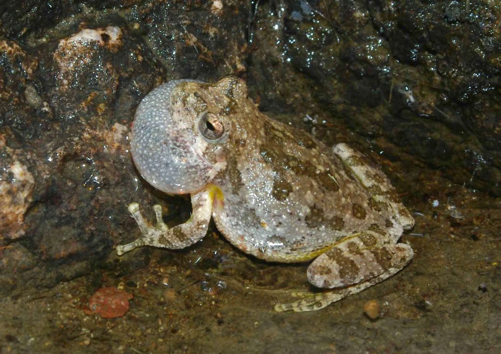 More than just light and dark, color in Hyla arenicolor is extremely complex, with individuals in different areas exhibiting color highlights that match the colors of the rocks in the canyon where they live. We can only assume that these colors are the result of selective pressures over time, as in the classic case of black and white moths on black and white trees in England (Kettlewell 1955).