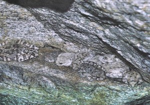 But different frogs also exhibit different landscapes of color; that is, individuals that can change from all-white to dark brown usually show a mottled pattern in between. This pattern is the result of patterns in the distribution of dermal color units. The match between the richness of the skin-color landscape of frogs in our local canyons and the richness of the rock landscape can be very striking (Fig. 2). These patterns must also be evolutionarily selected for, although the frog’s ability to change from light to dark influences how the pattern is expressed at any given time. The pattern on each individual frog, moreover, appears to be fixed. That is, you can probably photograph individual frogs and use this mottled pattern to keep track of them over time. It is this complex pattern, in combination with color change, that makes Canyon Treefrogs so difficult to see on rocks in the field.