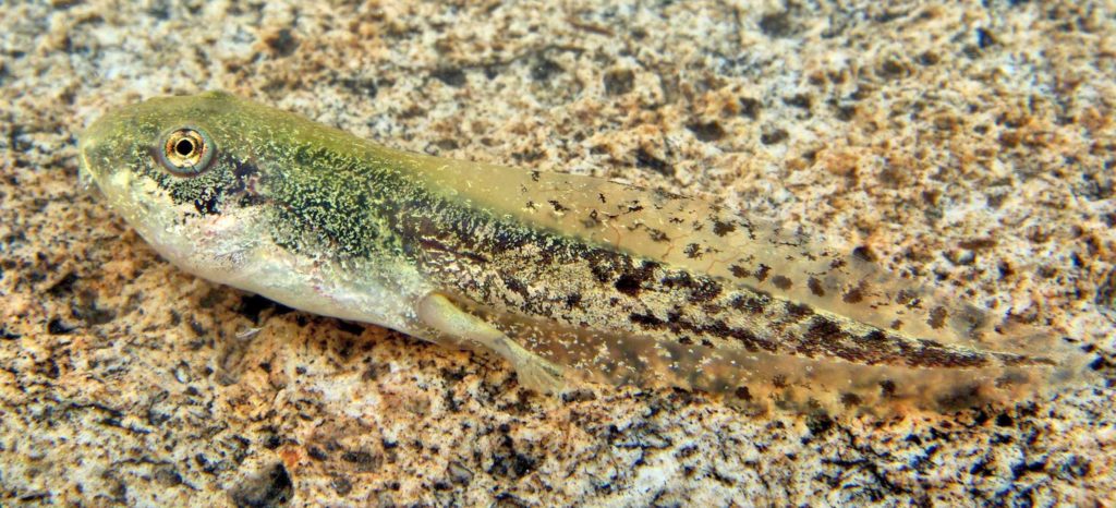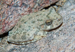 The Canyon Treefrog (Hyla arenicolor) is probably the most common frog in the Santa Catalinas, Rincons, Santa Ritas, and other Sky Island mountain ranges surrounding Tucson. Half-true to their name, Canyon Treefrogs live in the ephemeral waterways that spill out of these mountains. But they seem to prefer rocks over trees, and typically can be found adhered to boulders and cliffs above the pools of water where they breed and lay their eggs. This species is not confined to the Tucson area, or even to desert foothills. It is a wide-ranging frog that occurs as far south in Mexico as Oaxaca, as far north as southern Utah and southeastern Colorado, and there are isolated populations in Texas and Nevada. Canyon Treefrogs have a very wide elevational range, from sea level in Mexico to nearly 10,000 feet (3048 m) in Arizona’s Sky Islands (Stebbins 2003). DNA evidence indicates 3 deeply divergent lineages, which suggests that the taxonomy of this species may need to be revised (Barber 1999).